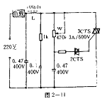 圖2--11電路簡單實用經濟。可以用作調速、調溫等多種用途。該電路的工作原理是常規的阻容移相觸發可控硅,使可控硅的導通角改變以調節負載電流,使相應的負載功能得到調節。調節W即可控制3A 600V