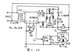 圖1-14所示的電路是采用KTM03型模塊控制單向可控硅的交流調壓電路。該線路簡單工作可靠,電壓穩定度較高,干擾較小。該電路調壓原理是:負載RL兩端的電壓URL受控予U1。而U1正比于URL。當調W1使URL為預置值時.若URL升高或降低,則U1也升高或降低.使KTM03內部控制電平降低或升高,觸發SCR