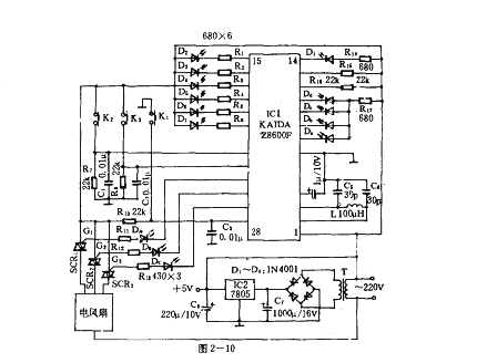 圖2一10所示是多功能電風(fēng)扇可控硅控制器。該控制器是采用KAlDA Z8600F電腦芯片為核心的控制電路。它具有弱、中、強三種風(fēng)速;15分鐘至4小時45分鐘的定時;隨機自然風(fēng)以及按7種程序控制風(fēng)量的指示功能。
