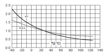 維持電流IH是從導(dǎo)通狀態(tài)轉(zhuǎn)變到阻斷狀態(tài)時(shí),所必需的最小主電流。與結(jié)溫有關(guān),結(jié)溫越高,則IH越小。
