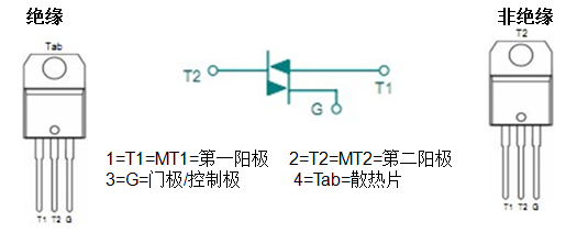 雙向可控硅 TRIAC為三端元件,其三端分別為T1 (第二端子或第二陽(yáng)極),T 2(第一端子或第一陽(yáng)極)和G(控制極)亦為一閘極控制開(kāi)關(guān),無(wú)論于正向或反向電壓時(shí)皆可導(dǎo)通。因?yàn)樗请p向元件,所以不管T1 ,T2的電壓極性如何,若閘極有信號(hào)加入時(shí),則T1 ,T2間呈導(dǎo)通狀態(tài);反之,無(wú)加閘極觸發(fā)信號(hào),則T1 ,T2間有極高的阻抗。