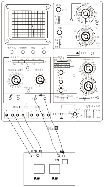 1.1 用五根兩頭帶插頭的一端分別插入 QT2 型圖示儀面板上的左下端的 E、C、B 和標有二極管符號“+”、“-”插孔內,并保持接觸良好。另一端分別接測試治具上標有“E、C、B”和“高壓”相應的插孔內。注意:圖示儀上的“E、B、C”應與測試治具上的“E、C、B”一一對應,“+”對應測試治具上的“高壓”紅端子或左邊端子;“-”對應測試治具“高壓”黑端子或右邊端子。3.2 將 Y 軸旋鈕旋到“100uA”。將 X 軸旋鈕選到“100V”位置;“功耗限制電阻”旋到“10K”位置;“階梯信號”組的“作用”開關打到“關”位置,“幅度/級”選擇開關旋到“20 uA”位置;按下“3000V輸出電壓”選擇開關,旋動“峰值電壓”旋鈕,使水平方向的光標成一水平橫線,其值為 700V 左右。