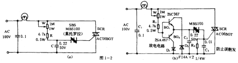 圖l一2(b)由晶體三極管、晶體二極管組成消除滯后現象的電路。C3用作防止誤觸發。調節W即可改變C2的充電時間,實現調光。