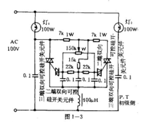 圖1一3所示的電路,是使兩盞電燈交叉調(diào)光。當(dāng)調(diào)節(jié)W時,一盞燈由暗變亮,而另一盞燈則由亮變暗。其道理是,調(diào)節(jié)W時,其中一只可控硅的導(dǎo)通角由小變大,另一只可控硅的導(dǎo)通角則由大變小。