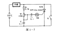 圖1一7中閉合K時(shí),調(diào)壓電路不起作用。這時(shí)負(fù)載得到全功率。斷開K時(shí),負(fù)載所得功率被SCR單向可控硅調(diào)壓電路控制。調(diào)節(jié)W可改變C1的充電時(shí)間.也就改變SCR單向可控硅的導(dǎo)通角,負(fù)載取得的功率即受到調(diào)節(jié)。負(fù)載取得的最大功率只是半波整流有效值的95%。本圖可控最大功率約1000W。